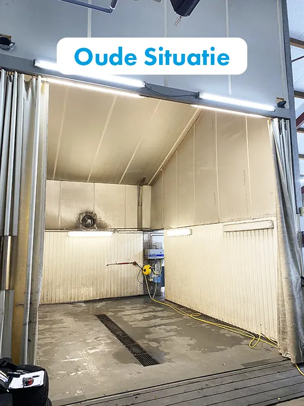 Wenn man die alte Situation mit dem Endergebnis vergleicht, ist der Unterschied sofort sichtbar. Der offene und weniger fertiggestellte Raum ist einer vollständig geschlossenen und professionell eingerichteten Waschhalle gewichen. Die komplette Fertigstellung fügt sich nahtlos in die umfassendere Modernisierung des Standorts ein.