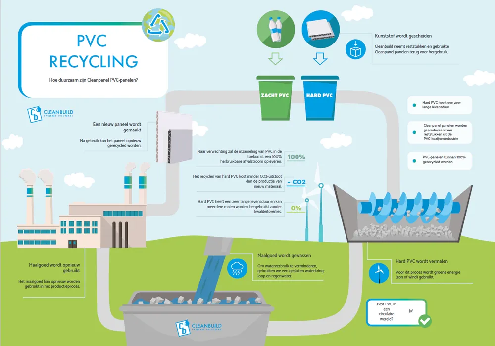 The current waste system is not yet geared to 100% PVC recycling. We therefore take as many measures related to sustainability as possible ourselves. By collecting, grinding and reusing PVC, we integrate circularity into the production process. As a result, Cleanpanel plastic panels are already a sustainable building material.