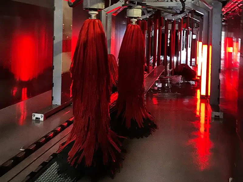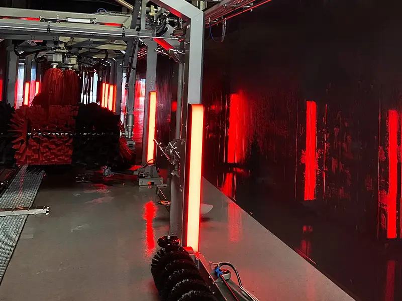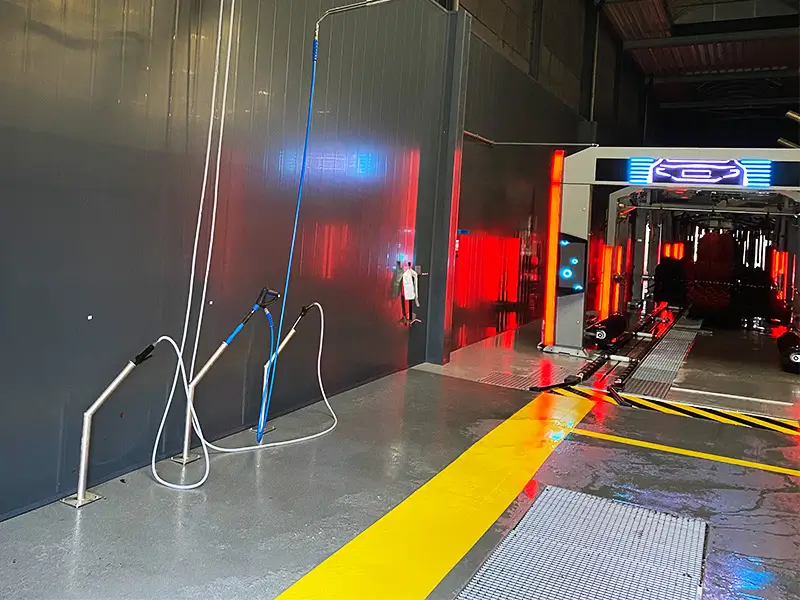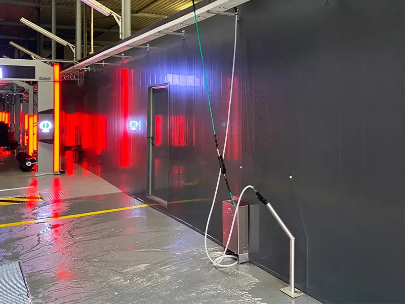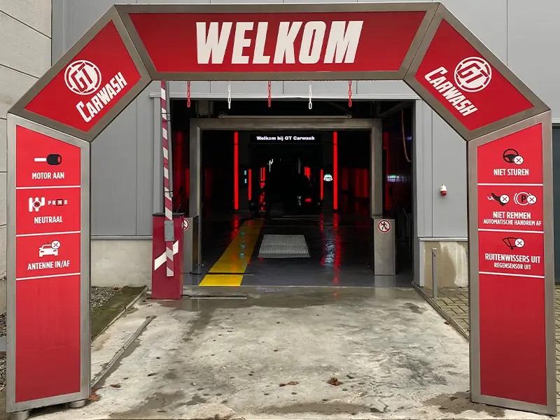 De grijze kleur voegt bij deze carwash absoluut iets toe: in combinatie met de rode LED-verlichting wordt een heel eigen sfeer gecreëerd. Met 45 meter lengte is deze kettingwasstraat een hele belevenis voor de klant. De carwash is uitgerust met een nieuwe machine van PRO Wash uit België.